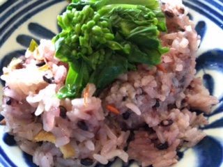 ゴボウは炊き込み、ニンジンとお揚げは別に炊いて合わせ、菜の花は塩ゆでにして春のおこわ。