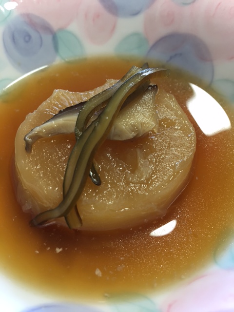 うどんのお汁(昆布出汁)が余ったので、大根を炊く。
