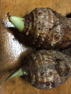 芽が出始めて、その根元の白い部分、将来芋茎になるところだけれど、