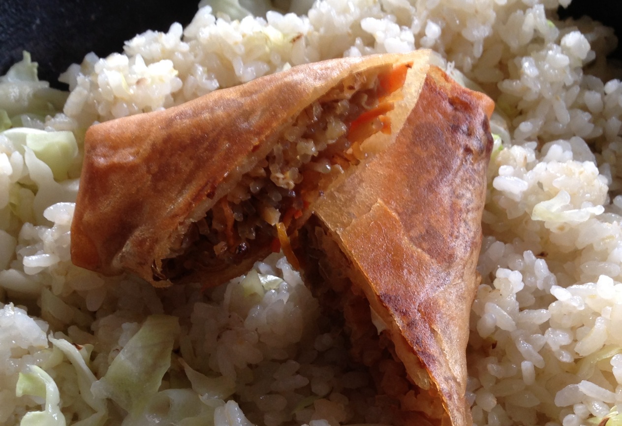 みじん切りの玉ねぎ、人参、ピーマン、春雨、炊いた炒り玄米をごま油で炒め、塩コショウで調え、春巻きの皮で包んでからりと揚げます。