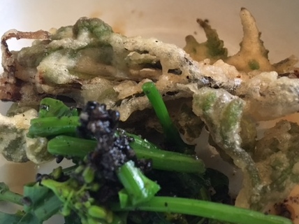 山椒の若芽とワラビを摘んでテンプラ。揚げるだけ、アク抜きは不要。かき菜のごま和えを添えて。