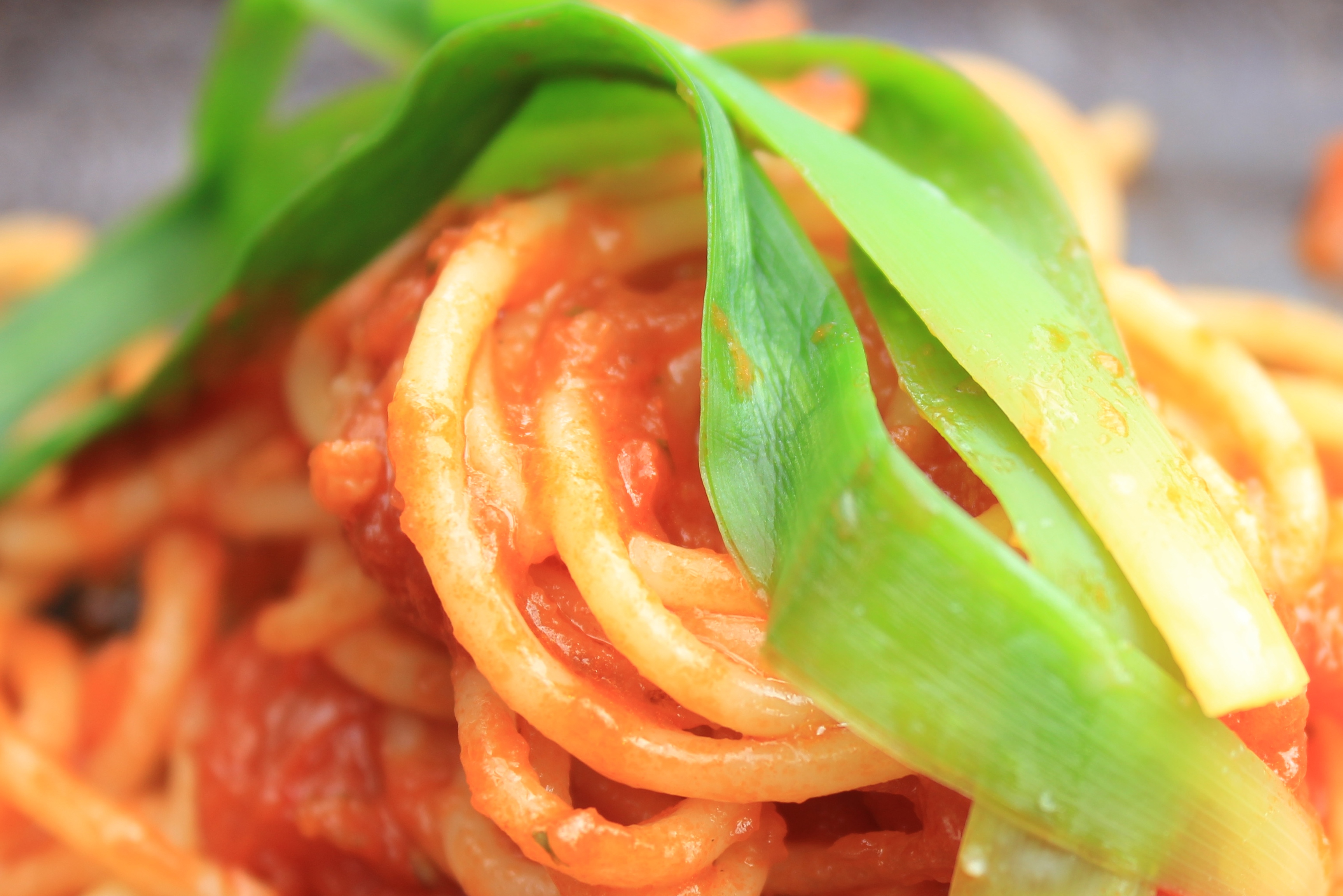 岐阜のキムラ家でパスタとノカンゾウ。さっとゆでるだけ。