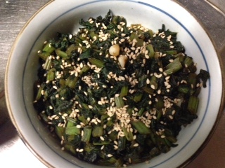 ご飯、季節の野菜とわかめの味噌汁、季節の野菜の漬物。野菜をたくさん食べるとよろしい。