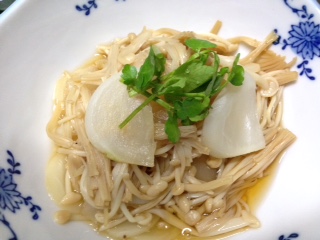 エノキダケを半分に切り、カブの薄切りを重ねて薄口しょうゆで蒸し煮します。