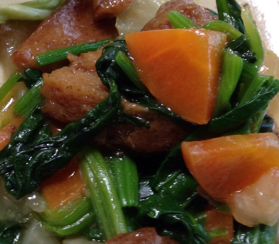もやし、大きな葉野菜、葱、キノコのスープを添えれば完璧。