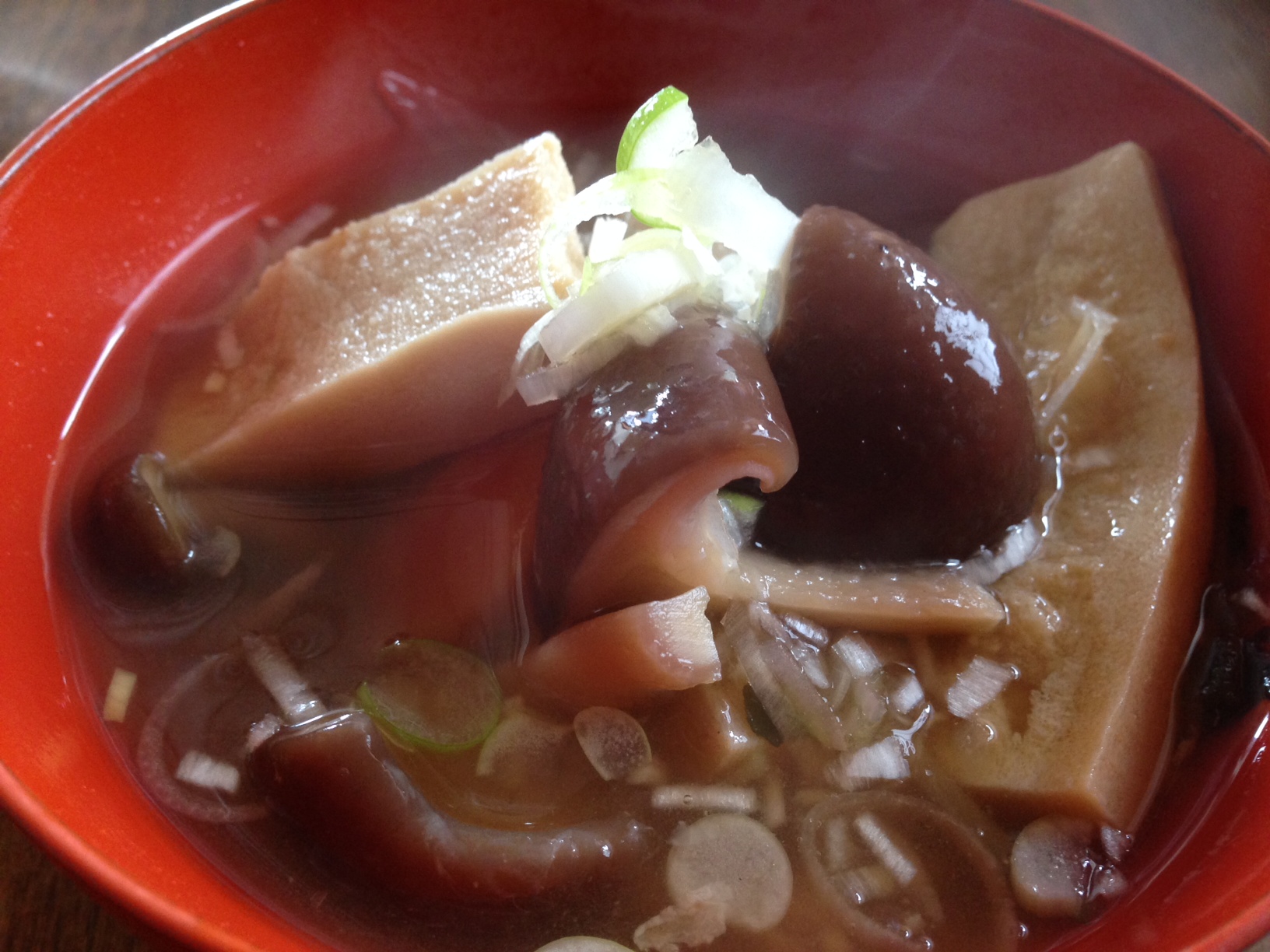 季節の野菜、炊いた炒り玄米、ひじき、がんもどきなどで作ったカレーをミキサーやブレンダーにかけ、醤油で調えてカレーうどん。