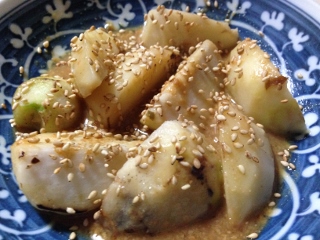 汁でゆるめた味噌をかけ、白ごまを振って利休にする。