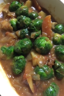 野菜のカレーが少し残っていたので、芽キャベツをごま油で炒め、塩蒸しして加える。