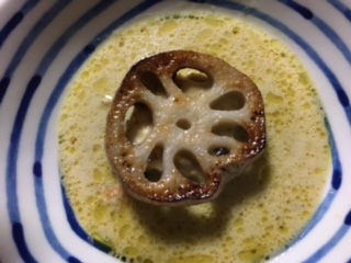 レンコンをソテーし、甘味を出して載せる。