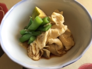 玉ねぎと蒸して、コショウ、オリーブ油、スダチ、味噌と合わせ、