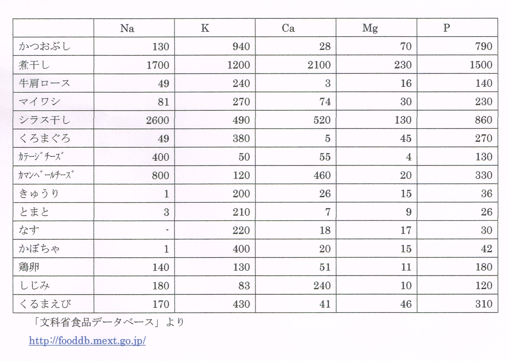 熱中症になりやすい。なので、陰性なカリウムとカルシウムを両方多く含むものを「たくさん」摂る。
